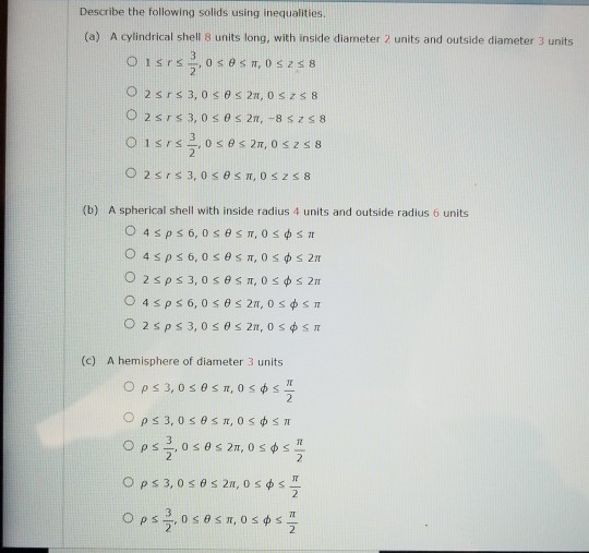 Follow asked Jul 20 2015 at 1818. How can I find the volume of a solid defined only by inequalities. A A cylindrical shell 8 units long with inside diameter 2 units and outside diameter 3 units b A spherical shell with inside radius 4 units and outside radius 6 units c A hemisphere of.